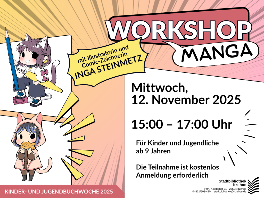 Im Rahmen der Kinder- und Jugendbuchwoche laden wir am Mittwoch, 12. November 2025, von 15:00 bis 17:00 Uhr, zu einem besonderen Highlight ein: einem Manga-Workshop für Kinder und Jugendliche ab 9 Jahren mit der Berliner Illustratorin und Comiczeichnerin Inga Steinmetz.